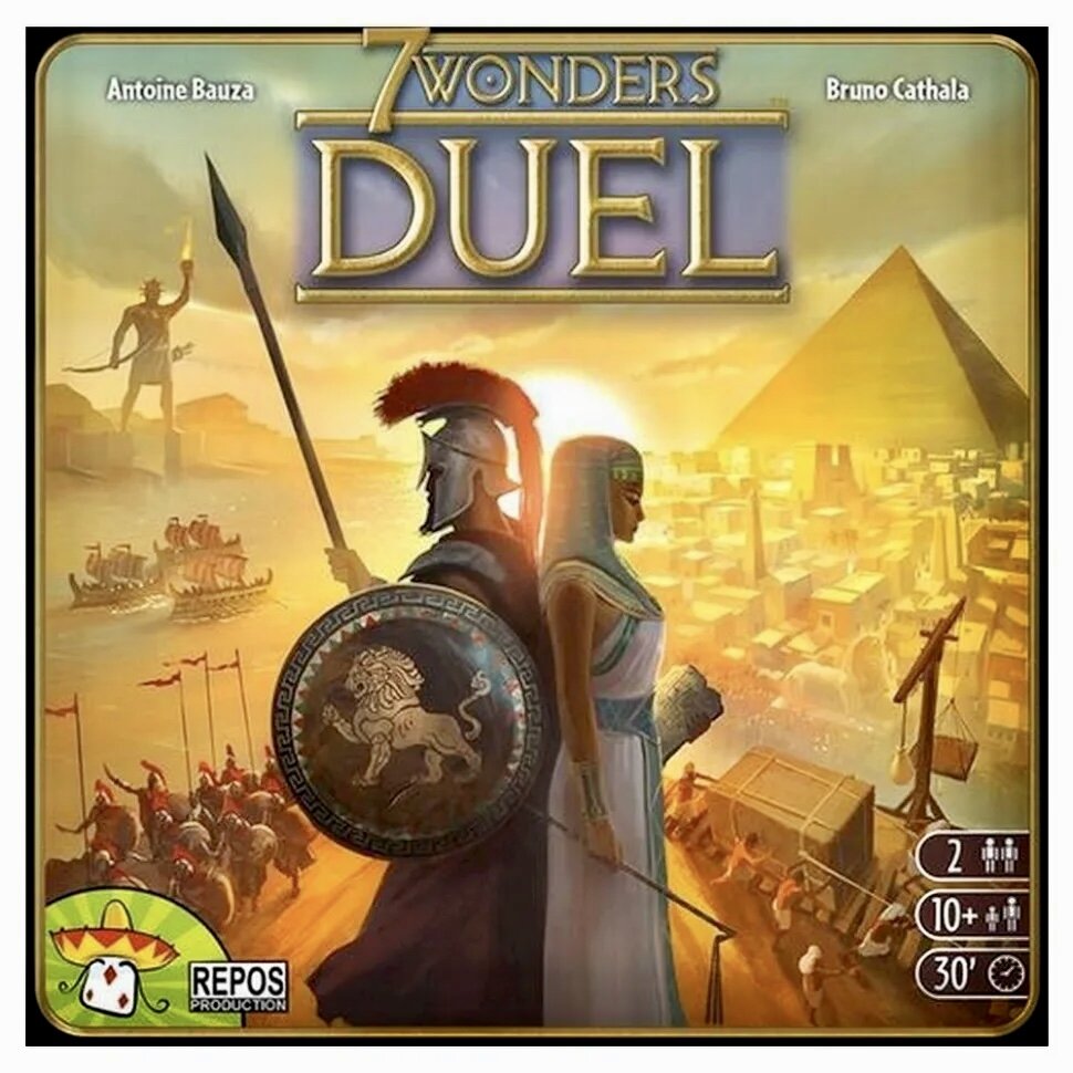 Настольная игра 7 чудес: Дуэль наиболее простая стратегическая игра из существующих настольных игр. В игре очень удобная иконографика и совсем нет текста, потому после недолгого объяснения правил игрок любого возраста быстро с лёгкостью проникнется ей и сразу после первой партии захочет сыграть ещё. Благо, игра очень быстрая. Как во всех сложных стратегических играх в этой есть несколько способов победы: развитие цивилизации, культуры или военным путём. Игра разделена на 3 эпохи, с каждой эпохой стоимость строительства будет становиться более дорогой, будут появляться соответствующие данной эпохе постройки, будет чувствоваться развитие государства. А механически это будет выглядеть так: у игрока на старте имеются деньги для постройки, игрок выбирает из доступных одну карту, оплачивает её стоимость или сбрасывает, получая дополнительные деньги. Новое здание позволяет получать ресурсы, военное преимущество или развитие в культуре. Таким образом, каждая следующая покупка будет обходить