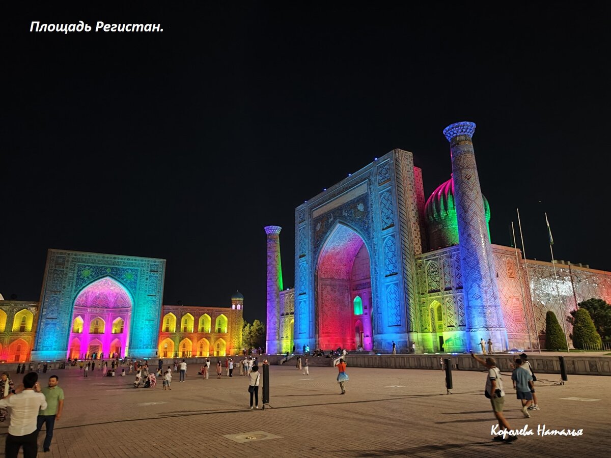 Вечером, с 21.00 до 22.00 прощать Регистан загорается яркими красками, звучит восточная музыка. Зрелище потрясающее, до мурашек. Обязательно посетите, если будите в этом прекрасном городе.