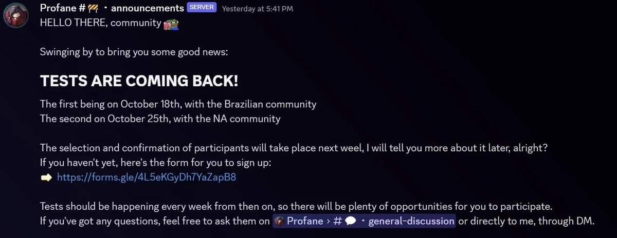 Разработчики MMORPG Profane в своем Discord сообщили, что тестирование игры начнутся 18 октября 2023 года. Игроки, желающие погрузиться в мир Profane, уже сейчас могут зарегистрироваться для участия. Первое игровое испытание запланировано на 18 октября и будет проводиться исключительно для бразильского сообщества. После этого, 25 октября, наступит очередь североамериканского сообщества. Отбор и подтверждение участников начнется на следующей неделе, а более подробная информация, по словам команды INSANE Game Studio, будет представлена в ближайшее время. Желающие могут записаться через специальную форму. Кроме того, разработчики намекнули на еженедельные тесты, что обеспечит игрокам множество возможностей для участия в них в дальнейшем. Profane — это MMORPG в элементами песочницы, которая обещает живой мир, наполненный динамичными приключениями, фракциями NPC и в значительной степени управляемый игроками. В игре реализована боевая система, основанная на навыках, позволяющая игрокам изуча
