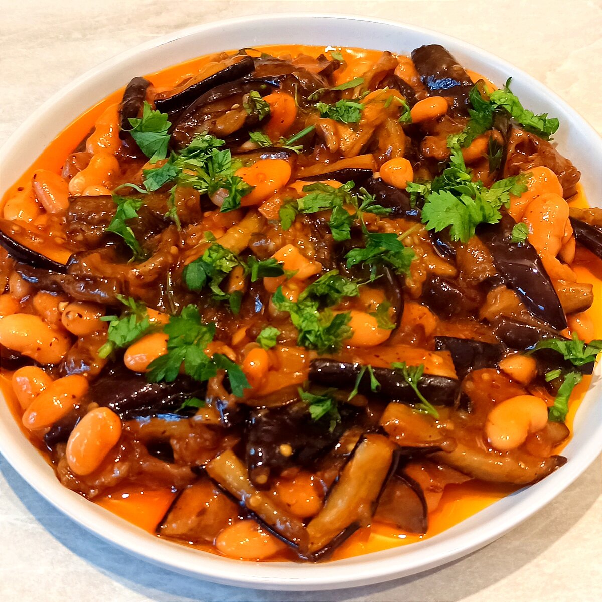 Как думаете баклажан ягода или овощ? Оказывается по биологической классификации он относится с ягоде из-за большого количества косточек, а в кулинарии принадлежит к овощам, так как в нём мало сахаров. Хочу предложить приготовить очень интересное и вкусное блюдо в тональности грузинской кухни. Рагу универсально - в холодном и горячем виде как закуска, как самостоятельный гарнир и в сочетании с рисом, картофелем и макаронными изделиями. Рецепт прост: 4 небольших баклажана 1 банка белой фасоли в томате (300 -350 г) 3 с. л растительного масла 1 с. л сливочного или топлёного масла 1 ч. л семян зиры, прованские травы, перец, соль зелень петрушки и кинзы Баклажаны нарезаем удобными для еды кусочками, сигментами примерно по 4-5 см. Поливаем растительным маслом, солим , приправляем прованскими травами и перемешиваем руками. Выкладываем на противень и отправляем в духовку примерно на 20-25 минут при 200° запекаться до румяной корочки. Можно обжарить на сковороде, но в духовом шкафу быстре
