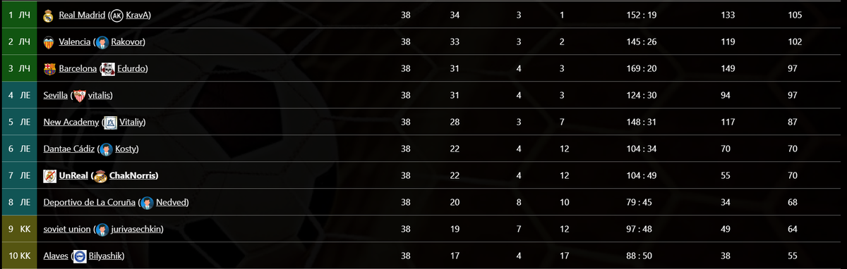 Доброго времени суток, друзья! С вами Испанский репортеришка UnReal! Сегодня мы разберем прошедший 113 сезон по косточкам, сравним с прошлым сезоном и сделаем выводы. Присаживайтесь поудобнее, советую взять тарелочку пельмешек и заварить чаёчка, потому что мы начинаем! Реал уже в 4-тый раз подряд берет чемпионство. Даже интересно, сколько еще титулов подряд возьмет Реал? Летучие мыши могли прервать гегемонию Реала на первом месте, не хватило прям немного. Поражение от Нью Академи и ничья со мной сыграли свою роль в недостатке очков. Пожелаем удачи Валенсии в следующем сезоне! 3 место все-таки ушло Барселоне по разнице мячей. Обидно, когда ты лишаешься бронзы из-за таких нюансов. Барселона не потеряла позиций с прошлого сезона (3 - 3), а вот Севилья ушла на 2 позиции вниз (2 - 4) 5 место наикрепчайшим образом закрепилось у Нью Академи. (5 - 5) +4 позиции сделал Дантэ Кадис! Хорошее возвращение в ЛЕ сделал клуб, не дав мне вернуться на 6 место. (10 - 6) На самом то деле обидно, что по ра