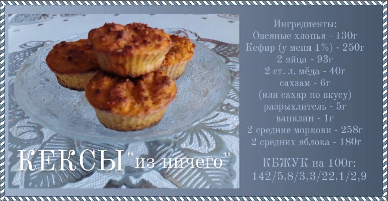 Долго думала, как назвать эти кексы) Морковные? Так там не только морковь) Овсяные? Там кроме овсянки ещё много всего) И решила их назвать так, как вы видите в заголовке статьи) Почему? Да потому что ингредиенты настолько простые, доступные и дешёвые, что так и получается - кексы из ничего) Ингредиенты: