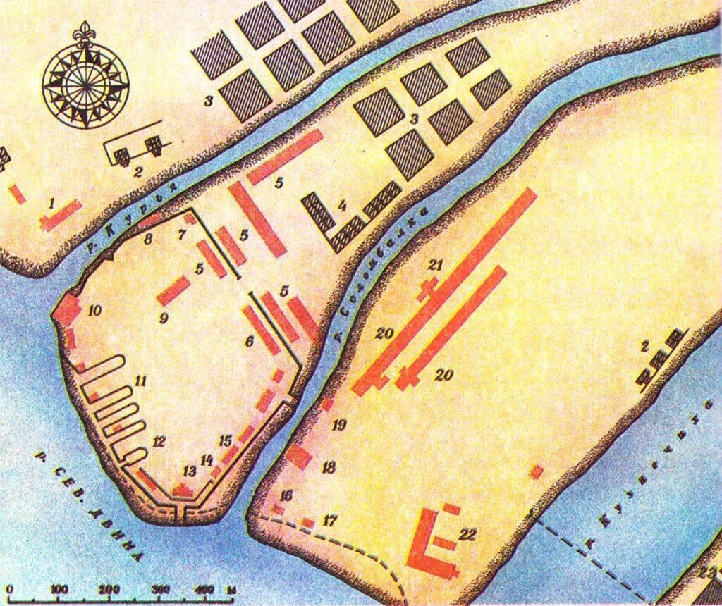 Действительно, производство больших парусных военных кораблей несколько сократилось - в 19 веке до начала Крымской Войны на Соломбальской Верфи было построено "всего лишь" 48 линейных кораблей и примерно такое же количество фрегатов, но это вовсе не означает, что объемы производства судов стали падать. Просто помимо больших военных судов начали выпускать "новую продукцию" - большие торговые и транспортные корабли, средние военные корабли, а также пароходы. Значительно расширилась и сама Соломбальская Верфь - к началу Крымской Войны это был самый настоящий кораблестроительный гигант, в состав которого входили десятки более мелких предприятий по всему Архангельскому Краю, на которых работали тысячи человек. Еще в 1820 году все деревянные строения в Соломбале были снесены, а взамен были построены новые производственные и административные каменные здания. Естественно , что не забывали и о безопасности - даже в мирное время в Двинской Губе постоянно патрулировала эскадра из нескольких больших кораблей, помимо этого подобные эскадры крейсировали в Белом и в Баренцевом Морях. Не исключалась и возможность морского десанта - с берега подходы к Архангельску и Соломбале прикрывали с десяток береговых батарей, помимо этого имелись и серьезные фортификационные сооружения на самом острове, прикрывающие Адмиралтейство и Флотский Экипаж(военно-морская часть). Само собой, что подобный военно-промышленный гигант должно было охранять соответствующее количество солдат.