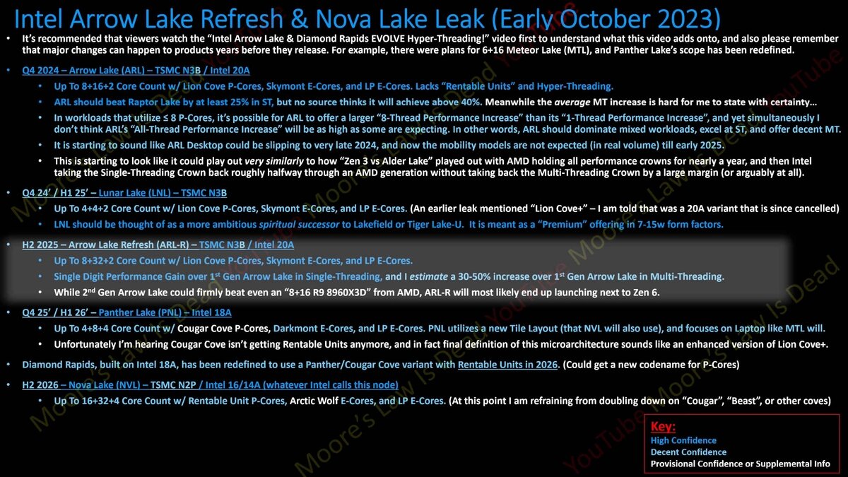 Известный инсайдер Moore's Law is Dead опубликовал новое видео с рядом интересных заявлений о грядущих процессорах Intel Arrow Lake, а также их рефрешах. Напомним, что в ближайшее время для десктопных ПК должны стать доступны "камни" Intel 14 поколения, которые являются рефрешами 13 поколения Raptor Lake, а вот до упомянутых Arrow Lake и их рефрешей придется подождать минимум год и два соответственно. 15 и 16 поколения, к слову, будут использовать новый сокет LGA-1851. Изначально Intel Arrow Lake получат до 26 ядер, 8 из которых будут "большими", а еще 18 - "маленькими", но в рефрешах на следующий год ожидается наличие уже до 32 "маленьких" ядер при неизменном количестве "больших". К слову, "камни" Intel после рефрешей Raptor Lake в этом году будут переименованы в Intel Core Ultra вместо Core i. https://youtu.be/FrS5tJ6mfkg