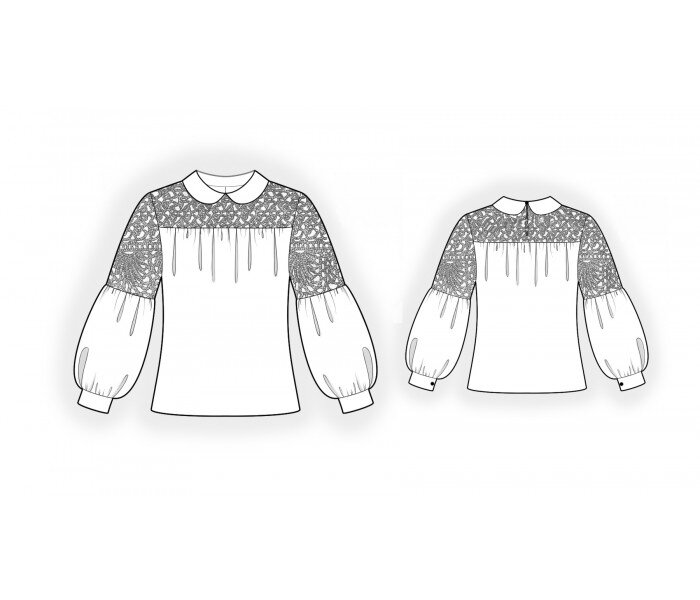 РЕКОМЕНДАЦИИ ПО ВЫБОРУ ТКАНИ: блузочные ткани из натуральных или смесовых волокон. Кружевное полотно в тон основной ткани.