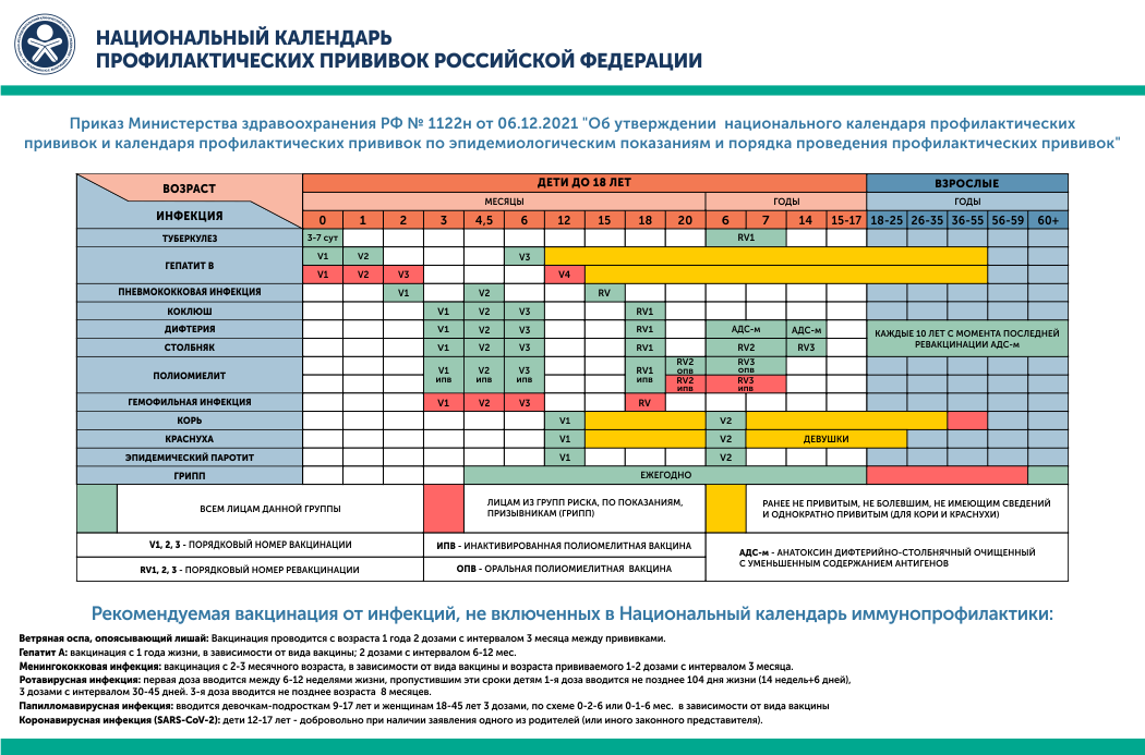 В России календарь прививок для детей регулируется Министерством здравоохранения Российской Федерации. Календарь может меняться со временем, поэтому для наилучшей актуальности информации рекомендуется обратиться к медицинским учреждениям или официальным источникам. Однако, обычно включаются следующие обязательные прививки: Вакцинация от туберкулеза (БЦЖ) Вакцинация от гепатита B Вакцинация от дифтерии, столбняка и коклюша (ДТП) Вакцинация от полиомиелита. Вакцинация от гемофильной инфекции типа b (ГИБ) Вакцинация от кори, краснухи и паротита (ККП) Вакцинация от вирусного гепатита A Вакцины до 12 месяцев: - против пневмококковой инфекции - 1-я вакцина против полиомиелита; - 1-я вакцина против гемофильной инфекции типа b (ГИБ) - 2-я вакцина против гемофильной инфекции типа b (ГИБ); - 2-я вакцина против полиомиелита - 3-я вакцина против гемоф