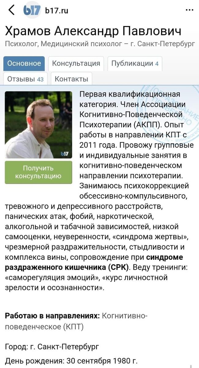 Александр Павлович замечательный психолог! Обращалась к нему за помощью по поводу своих проблем с СРК. Страдала от этой проблемы 9 лет, становилось то немного лучше, то хуже, куча врачей и анализов, но качественно жизнь не менялась. Пока я не поняла, что надо решать эту проблему у себя голове и прямо сейчас. За этим я и обратилась к Александру Павловичу. Мне очень понравился его подход к сессиям. Он многое объясняет, даёт дополнительный материал для изучения и,конечно же, слушает и помогает разобраться в себе. По итогам наших продуктивных сессий я могу с уверенностью сказать,что СРК остался в прошлом! Я очень рада, что обратилась именно к нему и мой первый опыт работы с психологом оказался таким успешным. Большое спасибо!