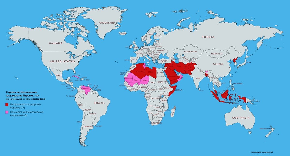 Сейчас, когда израильская повестка активно обсуждается в нашем обществе, я с огромным удивлением для себя обнаружил, что некоторые наши земляки просто не в курсе, что есть такие страны, которые с Израилем вообще отказываются иметь дипломатические отношения. И таких государств в мире достаточно. Вообще, все они делятся на тех, кто его никогда и не признавал, кто просто не имеет дипломатических отношений и кто их по тем или иным причинам разорвал. Если на карте, это выглядит примерно так: Почему не признают? Конечно же, из-за агрессии по отношению к Палестине. За это иудеев ненавидит добрая часть арабского мира. Кроме того, Израиль - страна без официально признанных границ, как такую в принципе можно за государство считать? В последние годы Байден изо всех сил пытался "уговорить" признать Израиль и Саудовскую Аравию. Даже денег обещал в качестве "военной помощи". Но, "что-то пошло не так". Так вот, с израильским паспортом вы не сможете въехать, к примеру, в ту же Саудовскую Аравию. На в