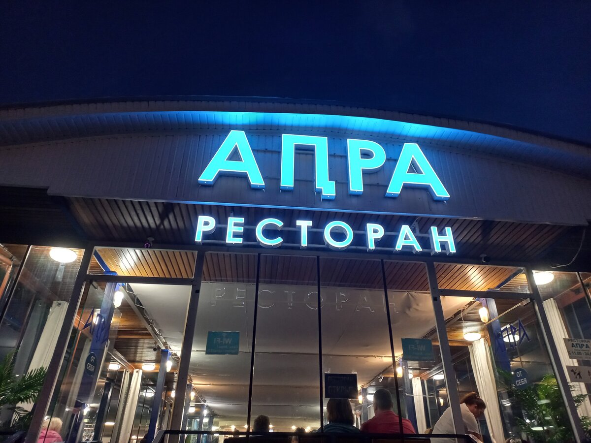 Всем привет! Очередным местом, которое мы посетили в Сухуме в этом году, стал ресторан "Апра", находящийся в самом сердце столицы Абхазии, на причале рядом со зданием порта. Первым, что привлекло нас, было, безусловно, расположение ресторана, поскольку из него открывается великолепный вид на Черное море и побережье. К тому же, о нем много пишут в сети Интернет, отзывы совершенно различные, поэтому мы решили заглянуть сюда во время традиционной вечерней прогулки по набережной и составить свое мнение о данном заведении. Итак, ресторан состоит из двух помещений: первое, при входе, с невысокими столиками и креслами, на мой взгляд, больше подходит для того, чтобы посидеть с напитками и легкими закусками, чем для полноценного ужина; а вот второе, в которое можно попасть, пройдя по коридору слева от барной стойки, однозначно, располагает к размеренному ужину в красивом интерьере. Также в этой части есть две небольшие террасы на открытом воздухе со столиками на двоих (к сожалению, их я