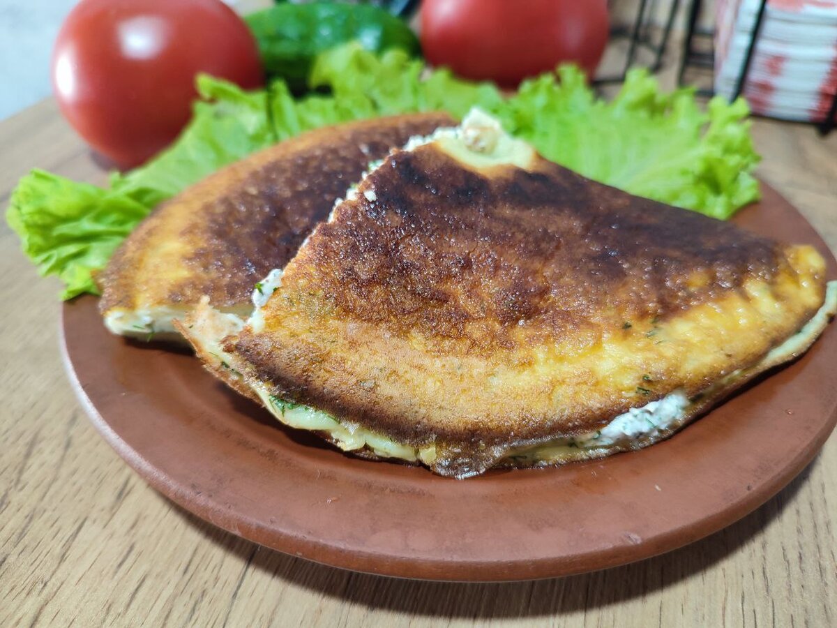 Когда яйца схватятся со сковородой, а верх еще будет немного жидким, выложите творожную начинку на половину и накройте крышкой.
