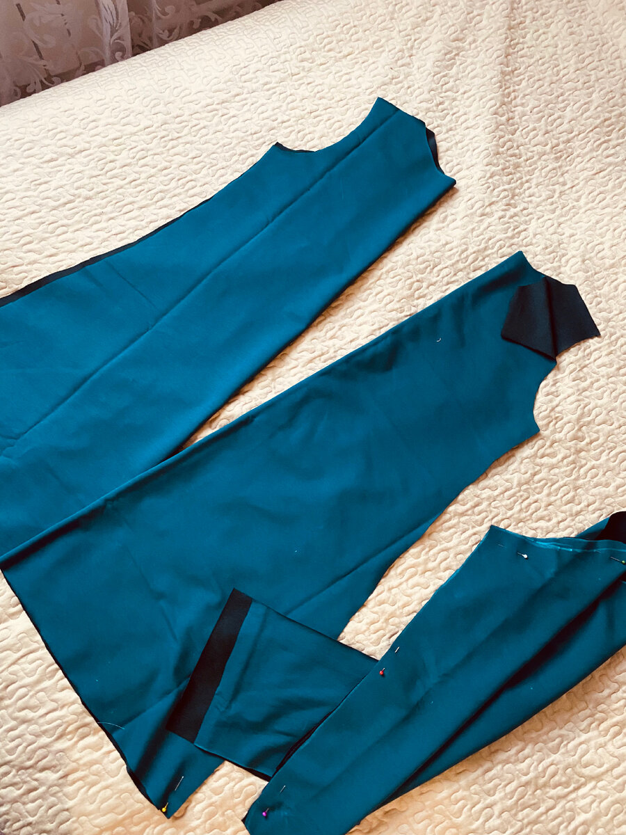 Сначала я сшиваю плечи платья, предварительно сколов булавками.