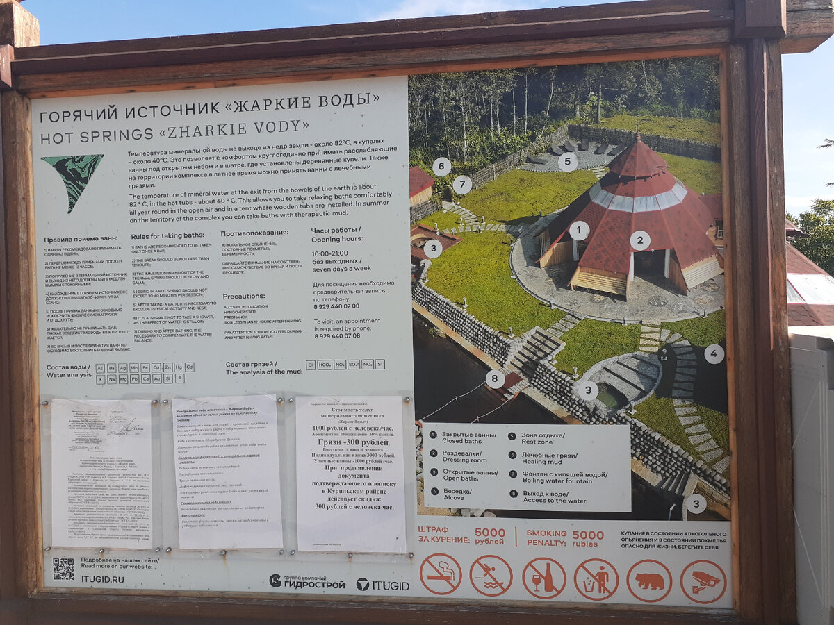 Комплекс "Жаркие воды". Этот комплекс меньше, чем "Кипящая речка". Здесь 6 ванн. Внутри скамейки. Можно сидеть, будет по пояс. Если сесть на дно, то по горло. На свежем воздухе есть горячая ванна, ну, очень горячая! А рядом речка бежит холодная, в ней мальки плавают. Можно окунуться :) Место отдыха. Есть еще грязи. Надо от домика идти по дорожке. Но мы не мазались. Прогрелись. Идем на выход. Вид назад. Дальше едем по берегу Охотского моря к Черным скалам. Вот уже и скалы видны. Продолжение следует... Начало День 1, 2 (9, 10 сентября) Сахалин День 3, 11 сентября Остров Итуруп Часть 1. Перелет Часть 2. Поселок Китовый Часть 3. Смотровая площадка "Тринога". Долина гейзеров Часть 4. Термальные источники "Кипящая речка" Часть 5. Отель "Итуруп" День 4, 12 сентября Остров Итуруп Часть 6. Бухта Оля