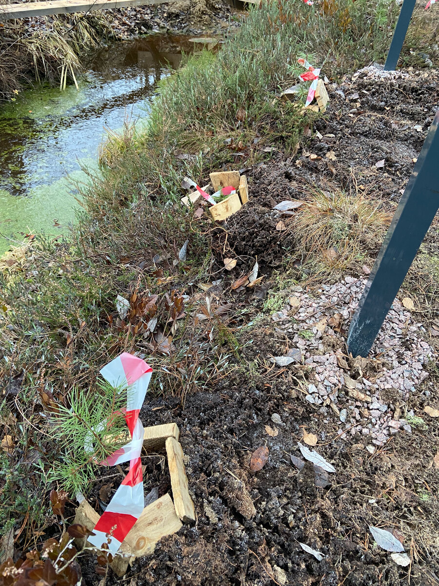 С целью сохранения их в процессе производства работ, обложила деревянными обрезками и привязала к каждому деревцу сигнальную ленту.