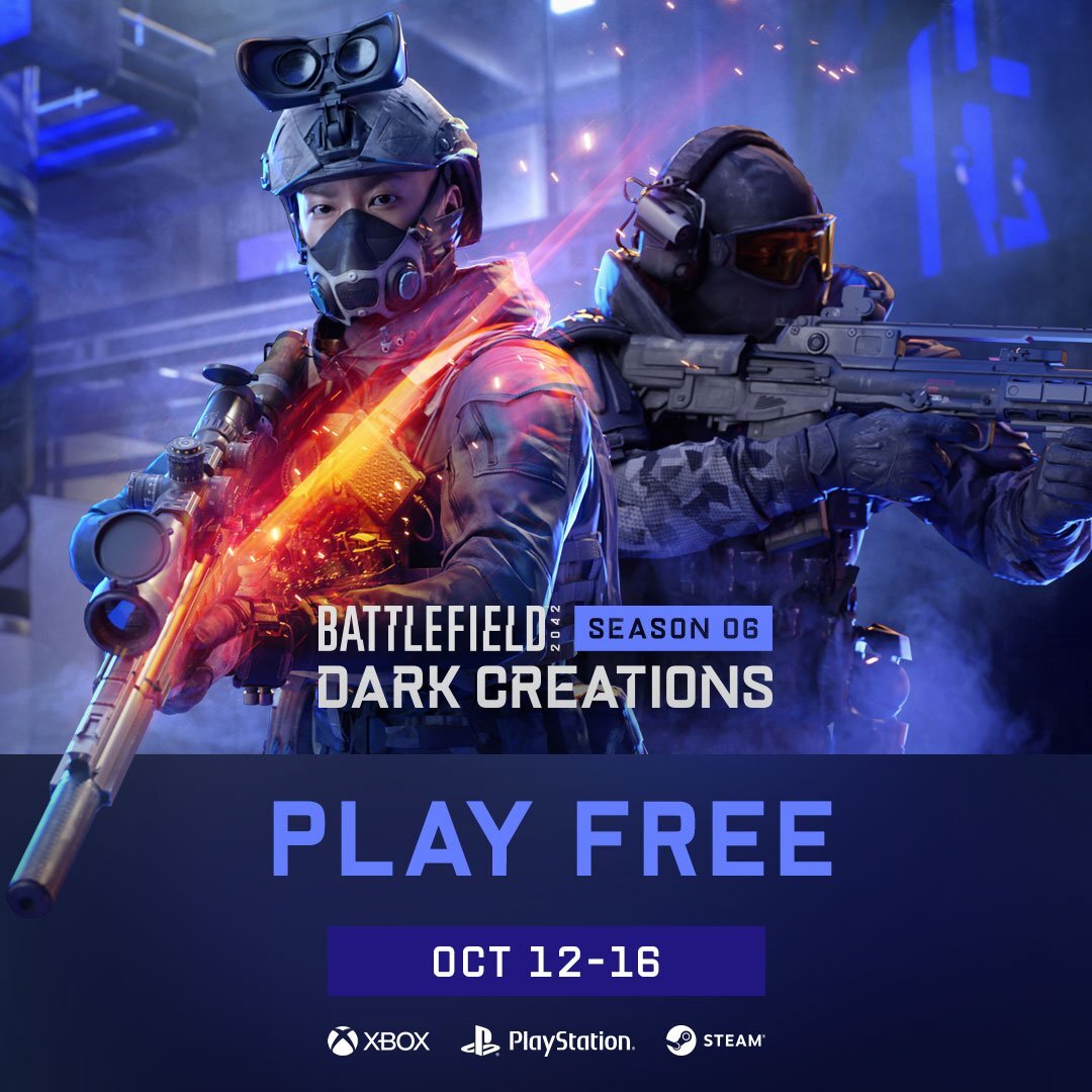 Уже 10 октября в Battlefield 2042 стартует шестой сезон, получивший название «Тёмные творения». В честь этого события шутер станет временно бесплатным — акция продлится с 12 по 16 октября. Со стартом нового сезона в игре появится ката «Засекречено», которая представляет собой секретную подземную лабораторию в Шотландии, технику YUV-2 Pondhawk, гаджет — метательные подсумки патронов и медицины, три модели оружия — G428, L9CZ и VHX D3, а также боевой пропуск с уникальными наградами, включая скины для специалистов, оружия и техники. Контент шестого сезона: Боевой пропуск: