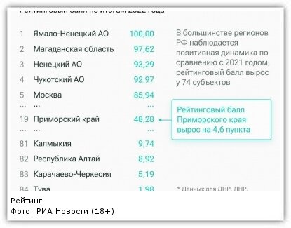 Приморский край попал в ТОП-20 рейтинга регионов по материальному благополучию населения за 2022 год, сообщает ИА PrimaMedia со ссылкой на РИА Новости (18+). Так, например, лидерами по благосостоянию стали Ямало-Ненецкий автономный округ, Магаданская область и Ненецкий автономный округ. В числе аутсайдеров — Карачаево-Черкесская Республика, Республика Тыва, а также Ингушетия. Соседний Хабаровский край обогнал приморский регион на 9 строчек и остановился на 10 позиции списка. Приморье же оказалось на 19 строчке. Рейтинговый бал края по итогам 2022 года составил 48,28. К слову, за 2021 год удалось достичь показателей в 43,71 балла. "Методика расчета рейтинга основана на агрегировании показателей, характеризующих материальное положение людей в регионах России по итогам 2022 года, — отношение медианных доходов населения к стоимости фиксированного набора потребительских товаров и услуг, среднемесячный объем вкладов (депозитов) и других привлеченных средств физических лиц в банках на одного