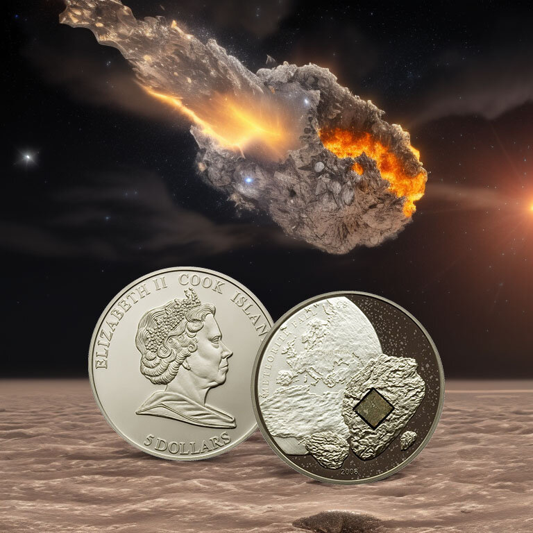 Эта редкая серебряная монета содержит фрагмент метеорита, который упал в Пултуске, Польша, в 1868 году. Площадь падения составила 127 квадратных километров, а вес самого крупного из известных фрагментов составляет 9 кг 95 г. Это настоящая редкость!