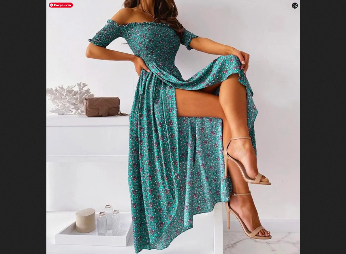 Оно представляет собой разноцветное платье макси с открытыми плечами, оборкой у груди, высоким разрезом и узкой талией. Также оно украшено цветочным принтом, который придаст ему особый шарм.