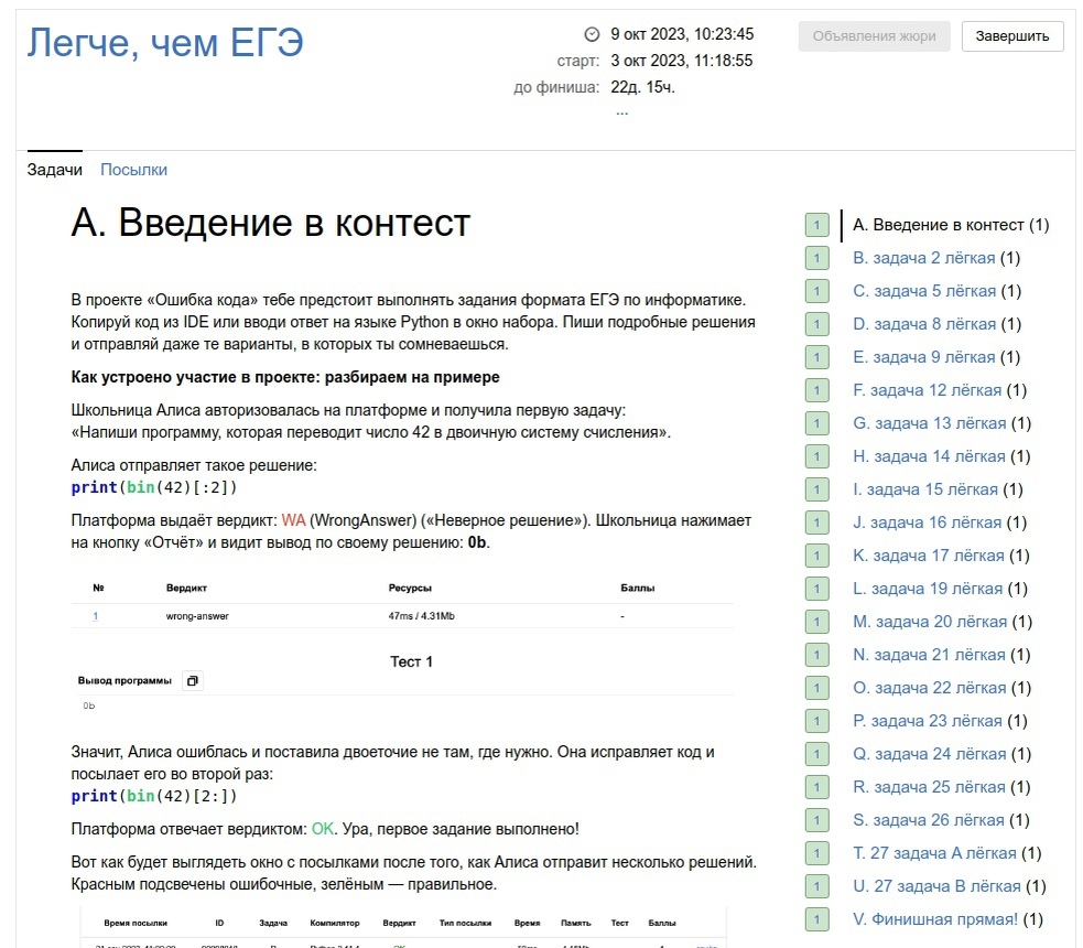 Недавно Яндекс запустил проект "Ошибка кода". Суть в том, что необходимо в Яндекс.Контест решать задания ЕГЭ, обязательно на питоне. При этом есть три разных контеста, по уровням сложности от легкого до сложного. Желательно при этом решать с ошибками, чтобы нейросеть обучилась на верных и неверных ответах. Сегодня закончил прорешивание легкого уровня. Заранее уточню, что предполагается, что сдавать надо программу, которая выводит только ответ.