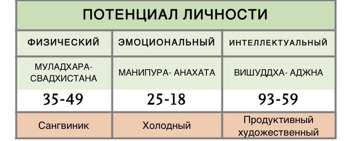 Плюс я смотрю по двум методам, это хронально-векторная диагностика (чакры и код судьбы) и ведическая нумерология (планетарная), и по планетам у нее есть раху, а раху это очень гениальные люди, у них очень хорошо работает голова и вместе с солнце, это проявленность и желания добиваться результатов, амбиций много, собственно это и видно вместе с чакрой вишудхой.
