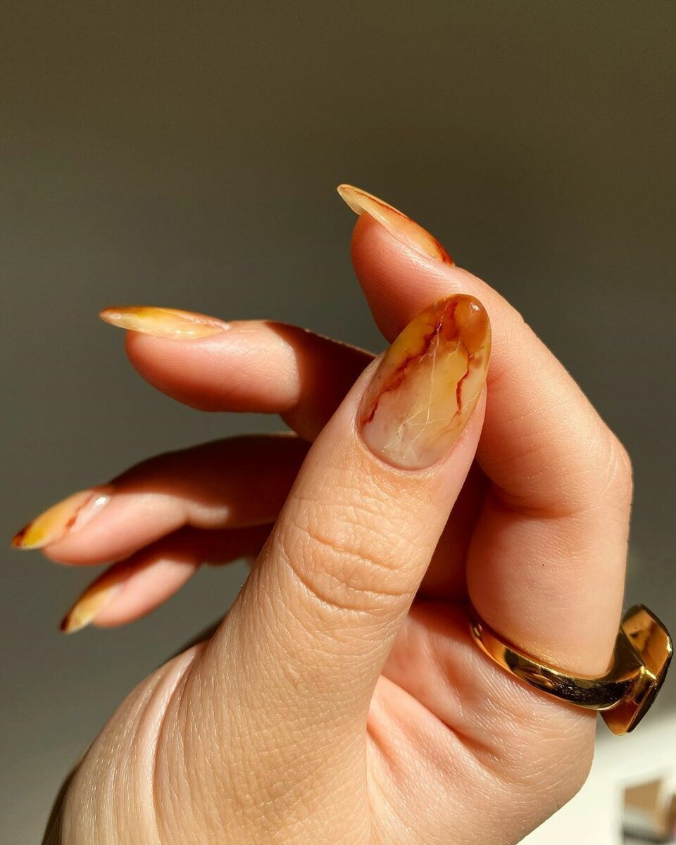 В темные осенние дни нам так хочется чего-то согревающего, радующего глаз - янтарный маникюр как нельзя кстати, тем более что это новый модный тренд! Стоит рассмотреть его подробнее. Натуральный янтарь имеет большую палитру оттенков - от светло-бежевого до насыщенно-коричневого, такие же мотивы мастера используют при создании модного маникюра. Можно рассмотреть варианты не тотального покрытия "янтарем", а использование вкраплений данного оттенка, что придаст изюминку маникюру: Посмотрите какой красивый оттенок) Лично мне янтарный маникюр представляется разновидностью маникюра "кошачий глаз" Как Вам новый тренд, будете делать такой маникюр? Напишите пожалуйста в комментариях. Буду благодарна за лайк статье и Вашу подписку