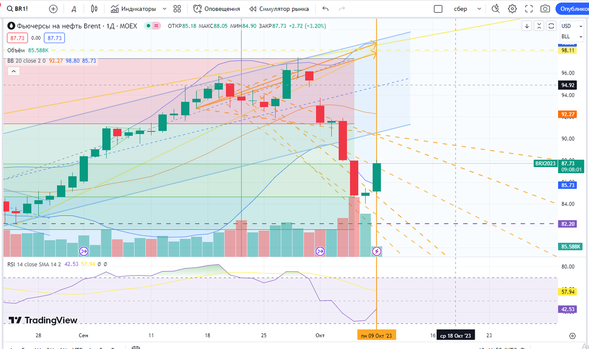 Есть не малый шанс, что да. Когда смотришь ТА, рисуешь линии, иногда не верится, что такое будет, особенно когда график идет совсем в другую сторону на каком-то мелком инфоповоде. Например, нефть шла по ТА на 97. Немного не дошла. Даже не ткнулась в сопротивление и развернулась аж до 84. Может ТА врет. Ну бывает. Существенный инфоповод может любую ТА завалить. Но потом была суббота. Сначала Эрдоган по сирийским каким-то повс танцам стр елял, и там как раз Америка "тайно" нефть ворует. А потом в Из раиле вой на. И почему-то кажется, что бом бежка подпольной нефтедобычи для цены существеннее. И ТА волшебным образом снова заработал: Тут на картинке и волновая (стрелка желтая) и волна вульфа (оранжевая стрелка) разом сошлись. Но толи рано отработали (конец сентября), толи поздно (не 5-7 октября). Тут не поняла ничего. Формально немного не дошли. Но это не точно. Коррекция по аккуратно ТА - по фибоначи. Гораздо интереснее на другом масштабе. Особенно желтя стрелочка. Даже интересно. 175