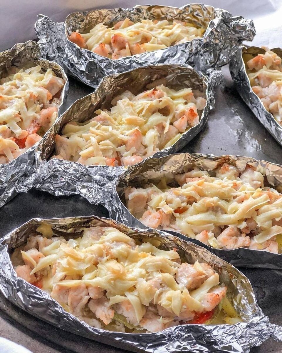 ЛОДОЧКИ С КУРИЦЕЙ✌ ⠀ ✔на 100 гр - 91 ккал Б/Ж/У - 10/3/6❗ Ингредиенты:⠀⠀⠀ Картошка - 5шт Куриные грудки - 2шт Кабачок - 1шт Сладкий перец - 2шт Сыр тертый -150г Соль, перец-по вкусу Приготовление: Картошку порезать кружочками, вымачивать не менее 2-3часов и отварить до полуготовности. Воду слить. Кабачок очистить от шкурки (если кабачок молодой, то можно со шкуркой), порезать кружочками и слегка обжарить на растительном масле. Выложить на бумажное полотенце, чтобы впиталось масло. Перец очистить от кожицы, порезать кубиками и тоже слегка обжарить. Курицу порезать небольшими кубиками и слегка обжарить. Из фольги сделать лодочки. Собираем блюдо: лодочки смазать растительным маслом. Первым слоем выложить картошку, затем кабачок, перец, курицу, сверху обильно посыпать сыром. Ставим в предварительно разогретую до 200град духовку на 20мин.