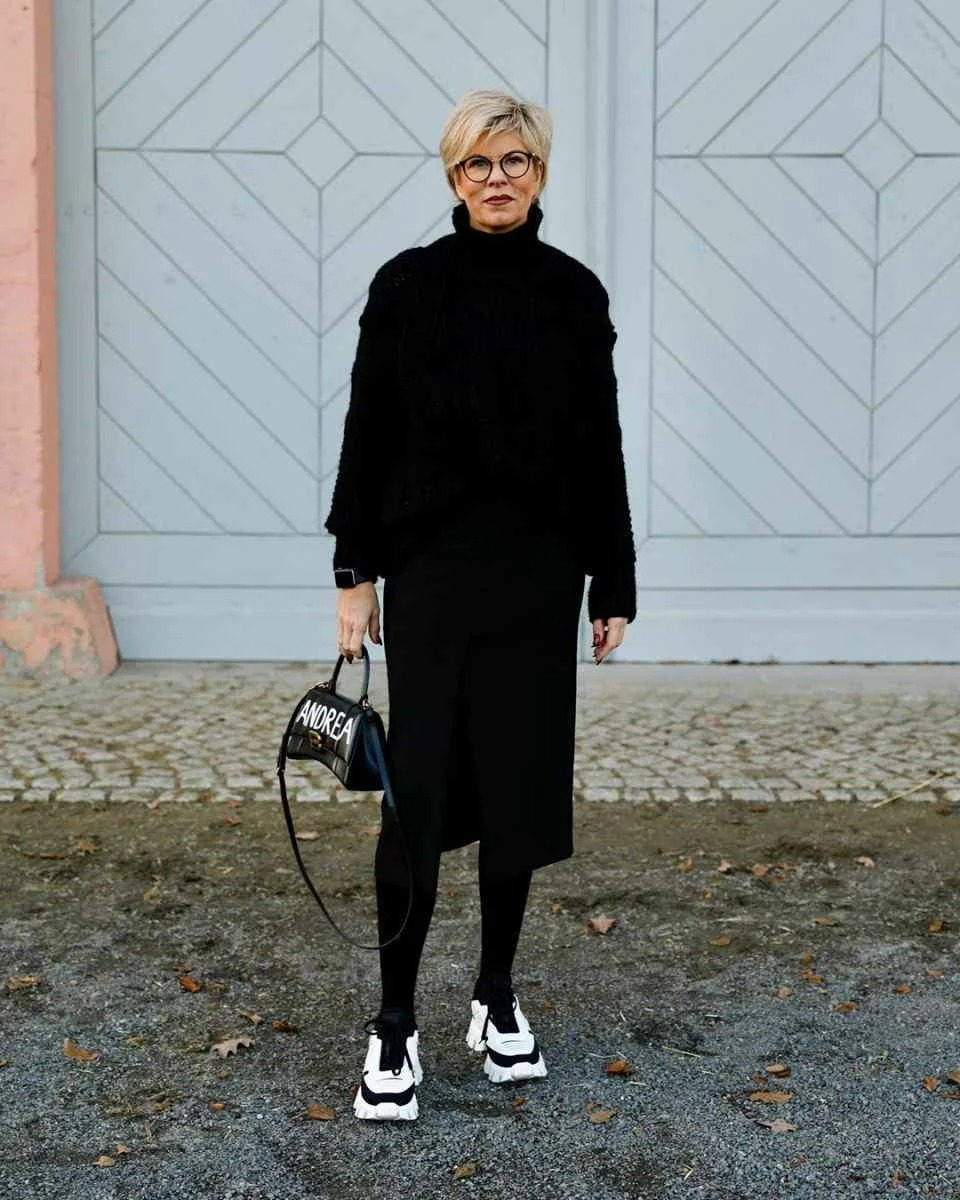- Прямое черное платье с длинными рукавами и застежкой на молнию по центру переда. Модель очень простая и очень удобная. В качестве отделки используется контрастная тесьма белого цвета, пришитая вдоль линии застежки с двух сторон от молнии. Такое платье отлично будет смотреться в комплекте с белыми кроссовками.