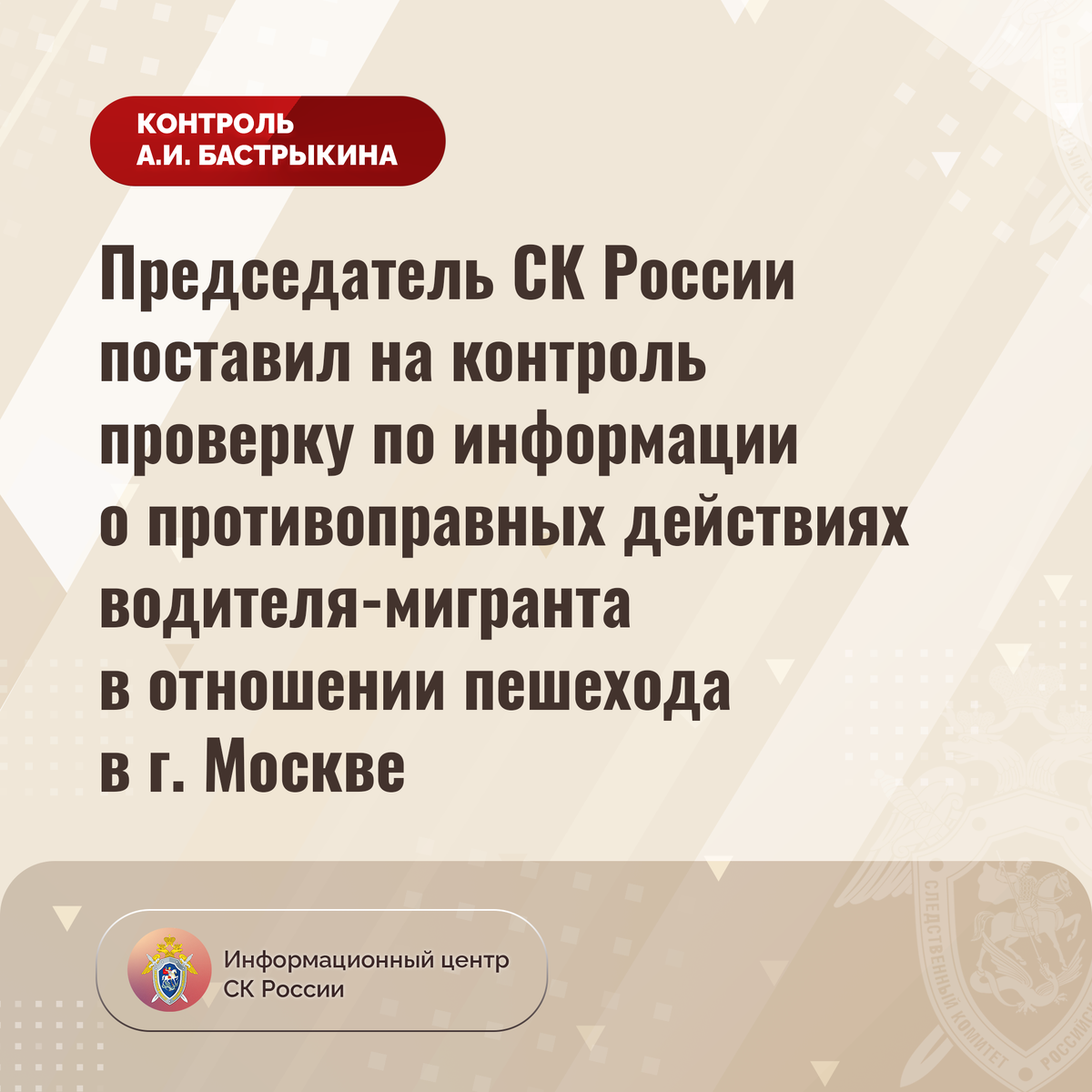 #СледственныйКомитет #СКРоссии #СКР #ИЦСКР #Информационныйцентр #АлександрБастрыкин #ПредседательСКР #КонтрольПредседателяСКР #КомментарийКон