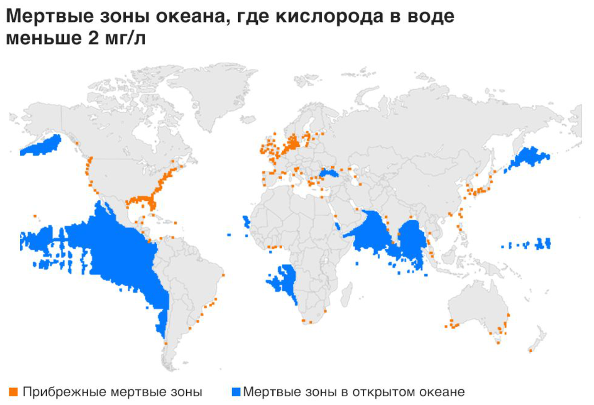 В связи с состоянием экологической системы нашей планеты, многие природные объекты находятся под угрозой. То же самое касается и вод мирового океана. В последние годы в нём появляется всё больше мёртвых зон. Что это, и какую опасность они несут? Мёртвыми зонами называют такие участки, где содержание кислорода является низким. Кислород является важным компонентом для существование морской флоры и фауны. Количество таких зон увеличилось почти на 50 процентов за последние пятнадцать лет. Основной причиной появления таких участков считается попадание в океан вместе со сточными водами различных удобрений, содержащих азот и фосфор. Поэтому зачастую «зоны смерти» (второе название для мёртвых зон) встречаются вдоль береговых линий и тех территорий, которые активно освоены человеком. Еще одной важной причиной считается глобальное потепление. Чем выше температура воды, тем хуже она поглощает кислород, поэтому его попадание в глубины вод затрудняется с каждым годом. На расширение мёртвых зон так
