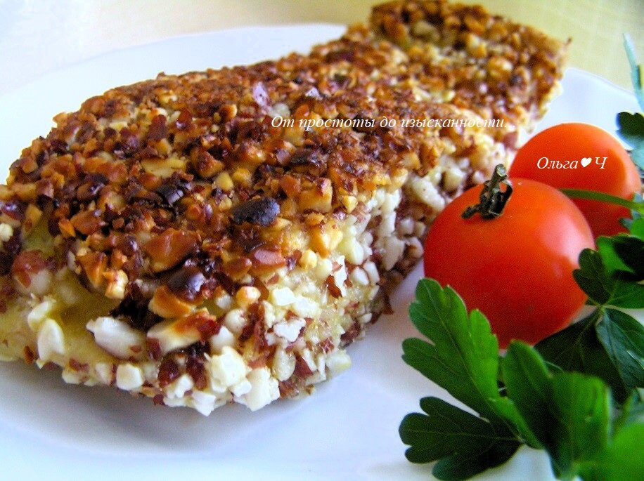 растительное масло для жарки Приготовление: Рыбу промойте, поперчите. Яйцо немного взбейте с адыгейской солью и сливками. Кусочки рыбы обваляйте в муке, затем в яичной смеси. В конце - в орехах. Обжарьте на растительном масле с двух сторон до готовности. Приятного аппетита!