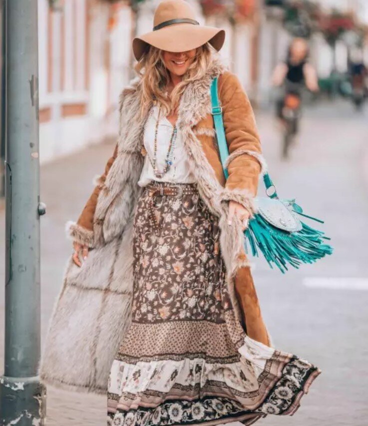 Совсем недавно мы рассказали вам о женщине Ивонн, стилисте и модели в стиле бохо в статье: Обязательно прочитайте ее! Сегодня мы продолжаем рассказывать об Ивонн, и в этот раз публикуем ее рекомендации по подготовке богемного образа к холодам и ее фотографии осенних образов в стиле бохо. Как создать свой осенний богемный образ женщине после 50? Особенностью осеннего стиля бохо является сочетание вроде бы несочетаемых вещей. Например, сочетание платья или юбки из тончайшего материала с кружевами и рюшами с кожаным пальто/дубленкой: ... с кожаной или джинсовой курткой: А вот и платья в стиле бохо, которые можно носить теплым осенним днем с фетровой шляпой и ботильонами: Если вы действительно хотите выглядеть осенью в стиле бохо, вам нужно иметь в своем шкафу вязание крючком вещи. Например, пальто: Большая шаль – это универсальная вещь в любом гардеробе и всегда выглядит очень женственно: Для настоящего богемного осеннего образа нужно иметь в гардеробе винтажное пальто в стиле 70-х. Таки