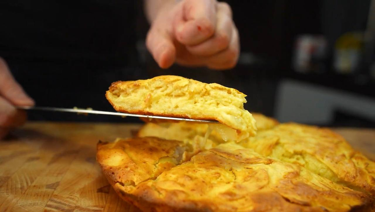 щепотка соли Яблоки очистите от кожуры. Счистите с лимона цедру и из половины лимона выжмите сок. Яблоки нарежьте на тонкие слайсы с помощью кухонного комбайна или рук. Сбрызните яблоки лимонным соком. Смешайте все ингредиенты для теста и замесите его. Готовое тесто добавьте к яблокам и перемешайте. Форму смажьте сливочным маслом и выложите получившуюся смесь. Заранее разогрейте духовку до 170 градусов и выпекайте 35-40 минут. Остудите немного готовый пирог и подавайте!