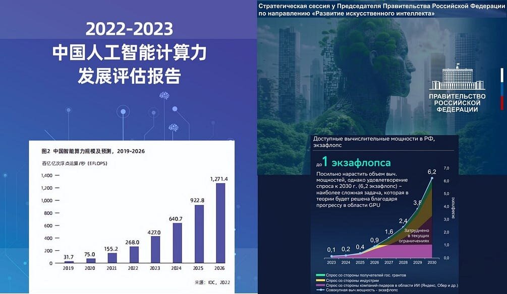 К 2030 отставание России может сократиться … до 3,5 тыс раз Эти кажущиеся бредом цифры следуют из сопоставления двух авторитетных источников. Первый из названных документов предполагает следующее. Второй из вышеназванных документов сообщает и предполагает абсолютно несравнимые по масштабу цифры. Также напомню, что в США вычислительная мощность инфраструктуры исследований, разработок и применения ИИ сейчас, где-то на 30–40% больше, чем у Китая (а к 2030 США планируют оторваться примерно в 2 раза за счет экспортных ограничений на микроэлектронику). В заключение, мне остается лишь с сожалением заметить вот что. Зря глава Сбера Герман Греф не начал свой 1й доклад на стратегической сессию с уже цитировавшегося им ранее анекдота про снаряды: «Здесь как в том анекдоте: назовите три причины, почему следует отступить? Причина первая: у нас нет снарядов. Вот так же и здесь: у нас нет такого количества снарядов». Ведь и с развитием ИИ то же самое: если нет и не планируется в России обретение ИИ и
