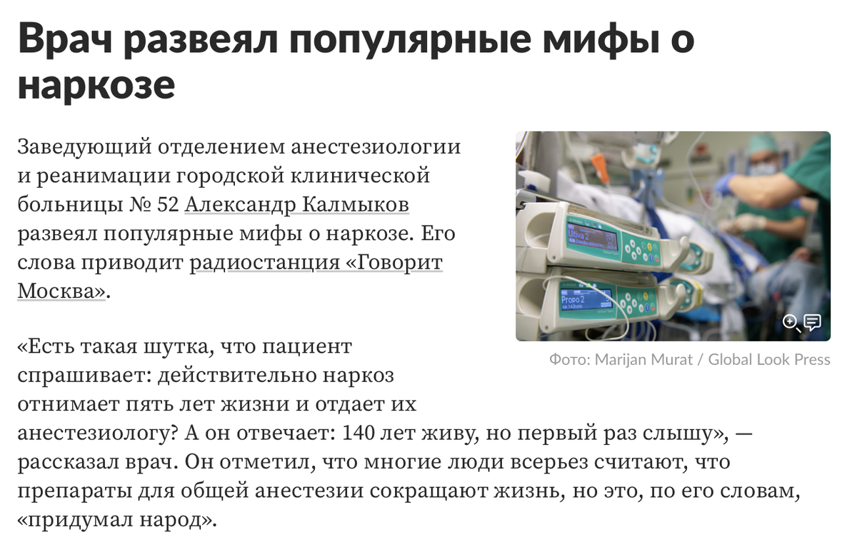 Разбираем фейки. Ищем правду за вас. Подписывайтесь! Интернет полон мифов о медицине. Одно из заблуждений, в частности, касается анестезии, дескать обезболивающие препараты могут отнять у пациента годы жизни. Забавно, что этот миф не находит никаких рациональных объяснений, и основан, судя по всему, на популярном анекдоте, что наркоз отнимает пять лет жизни у больного и отдает их анестезиологу. Вот что говорит о наркозе кандидат медицинских наук Владимир Багаев в своей научной статье «Перспективы ксеноновой анестезии в детской хирургии»: «Установлено, что Хе [ксенон] не влияет на углеводный, жировой, белковый, водно-электролитный обмены, показатели кислотно-щелочного состояния и газообмена, а такж