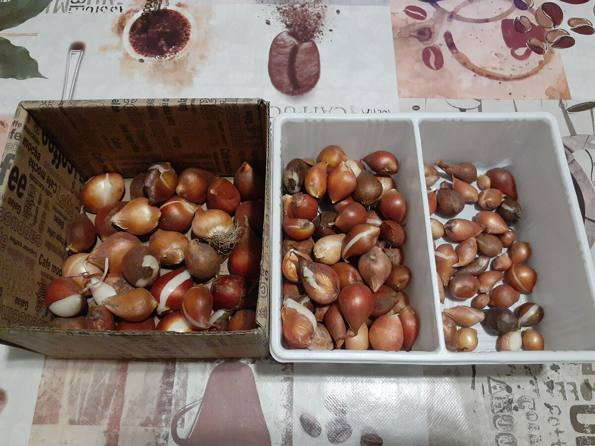 Мне отдали луковицы тюльпанов. Я их рассортировала примерно по размерам, хотела посадить в эти выходные. Но все выходные дождь. Завтра обещают снег.
