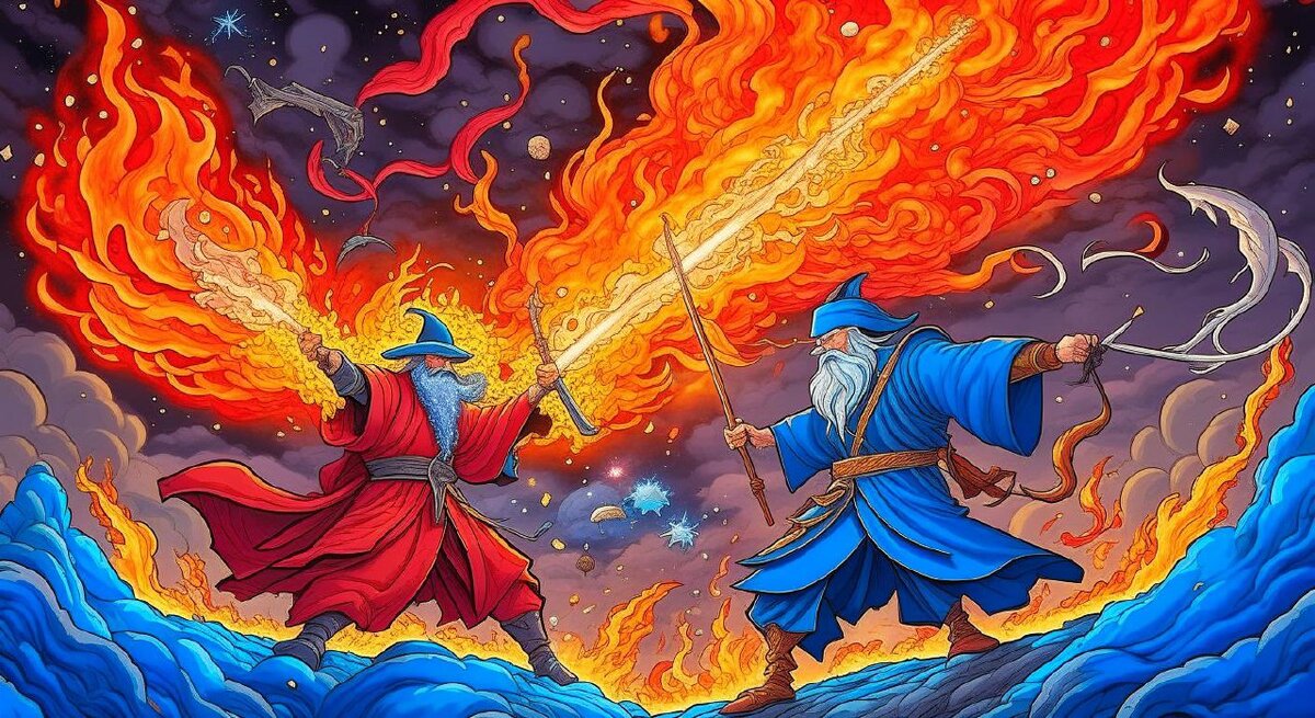 Сражение Магов или Колдунов всегда представляются как Эпичные Битвы с Обязательными Фаерболами, Взрывами, Ледяными Стрелами, Волшебными Куполами и прочее! Сценаристы и Фанаты - фэнтези, весьма в этом преуспели!