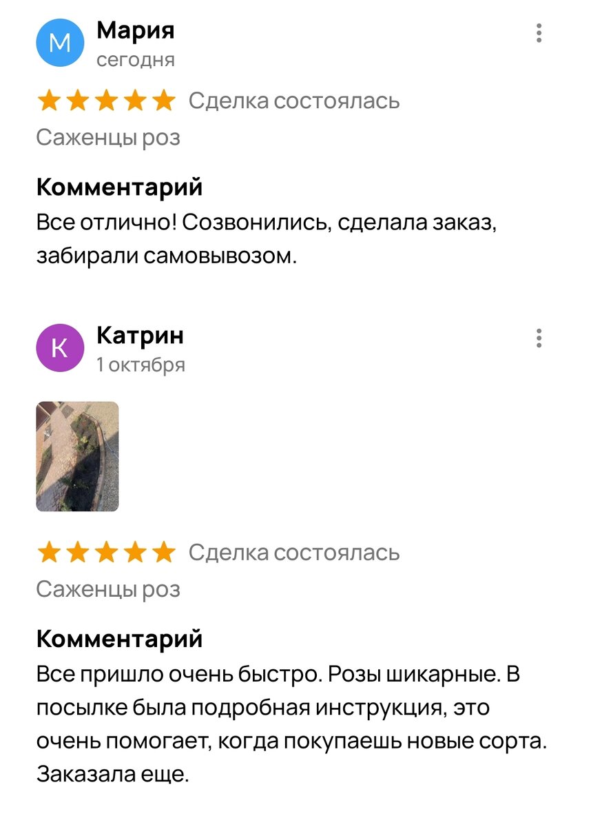 Спасибо большое , что выбираете наши саженцы роз, гортензий и других растений 🥰 Много работы осенью: копаю, упаковываю, складываю, доставляю, отправляю,... Извините , не успеваю сюда заглядывать чаще. Добавлю немного из отзывов сюда! Практически каждый при получении посылки или при посадке даёт положительные отзывы , эмоции. Чаще в телефоном разговоре, или в голосовом сообщении) Сюда немного из того, кто написал🥰🥰🥰 Спасибо большое за внимание 💜💜💜 😀 Приятного садоводства ! С уважением, Ксения, Rosebushes.ru 😀