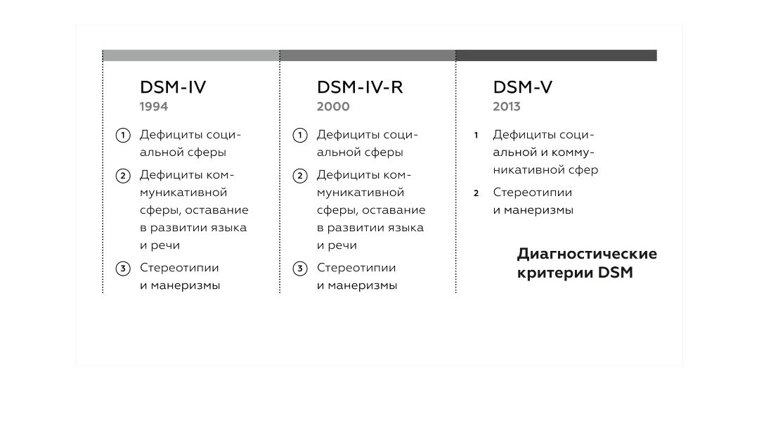 Понятие «аутизм» появляется в американской классификации в 3-ем издании по психическим расстройствам и описывает этот диагноз как явление трёхкомпонентное, включающее в себя расстройства по социальному взаимодействию, социальной коммуникации и развитии языка и речи и стереотипии. Но эти расстройства должны проявлять себя на определённом жизненном участке и как-то видоизменяться во время всего жизненного пути. При накоплении эмпирических материалов изменяется представление и классификации о РАС (расстройства аутистического спектра). МКБ, принятая у нас (международная классификация болезней и нарушений) отстает немного от DSM (Диагностическое Статистическое Руководство в США). В МКБ-10 к РАС относили РДА (Ранний детский аутизм), атипичный аутизм, синдром Ретта, другие интегративные расстройства детского возраста, синдром Каннера, синдром Аспергера. В настоящее время, собрав множество эмпирических данных и теории пришли к выводу, что расстройства аутистического спектра очень разнообра