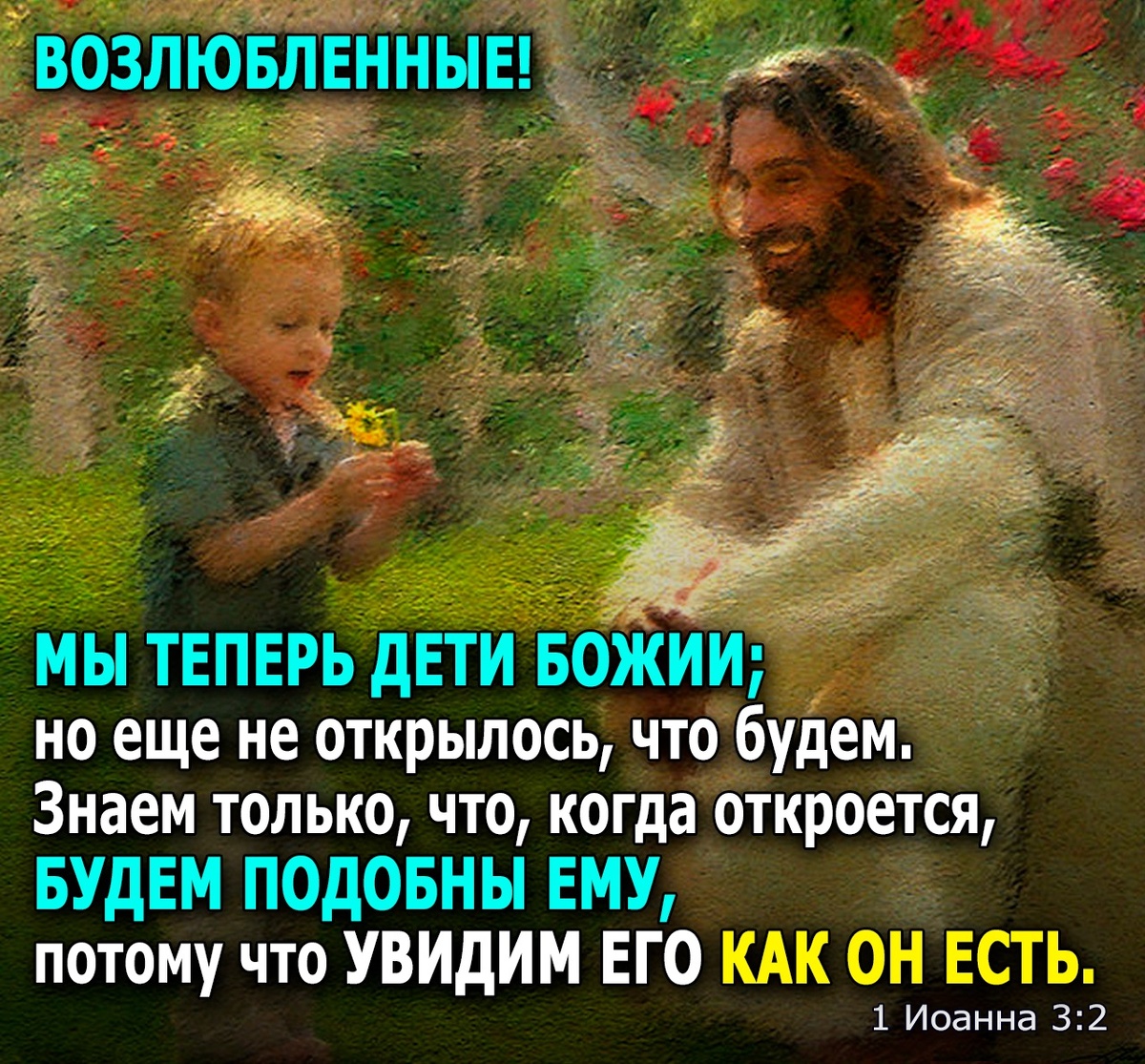 «Смотрите, какую любовь дал нам Отец, чтобы нам называться и быть детьми Божиими. Мир потому не знает нас, что не познал Его. Возлюбленные! Мы теперь дети Божии, но ещё не открылось, что будем. Знаем только, что, когда откроется, будем подобны Ему, потому что увидим Его, как Он есть. И всякий, имеющий эту надежду на Него, очищает себя, так как Он чист» (1 Ин. 3:1–3).