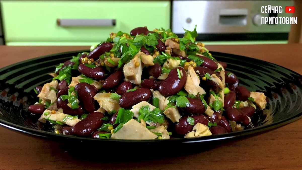 Сегодня готовлю очень вкусный и полезный салат, который подойдет не только для ежедневного меню, но и для праздничного стола. Салат с фасолью получается сытный, но лёгкий, все продукты в нем полезные и необходимые для нашего организма, а ещё они простые и доступные. 👇👇👇 Из банки с фасолью сливаем жидкость и выкладываем фасоль в дуршлаг, дадим стечь лишней влаге. Готовим заправку для салата. В миску соединяем 2 столовые ложки растительного масла, 2 столовые ложки соевого соуса, 1 столовую ложку зерновой горчицы. Добавляем 2-3 зубчика чеснока, перемешиваем и заправка готова. Отварное мясо нарезаем соломкой. Можно сделать фасолевый салат с любым мясом, подойдет курица или говядина, а вот от свинины лучше отказаться, слишком жирная, у меня сегодня филе бедра курицы. Зеленый лук моем, обсушиваем и нарезаем. Зелень петрушки также мелко нарезаем, можно взять еще укроп и кинзу, главное для этого рецепта возьмите по больше зелени. В миску высыпаем мясо, добавляем фасоль и нарезанную зелень.