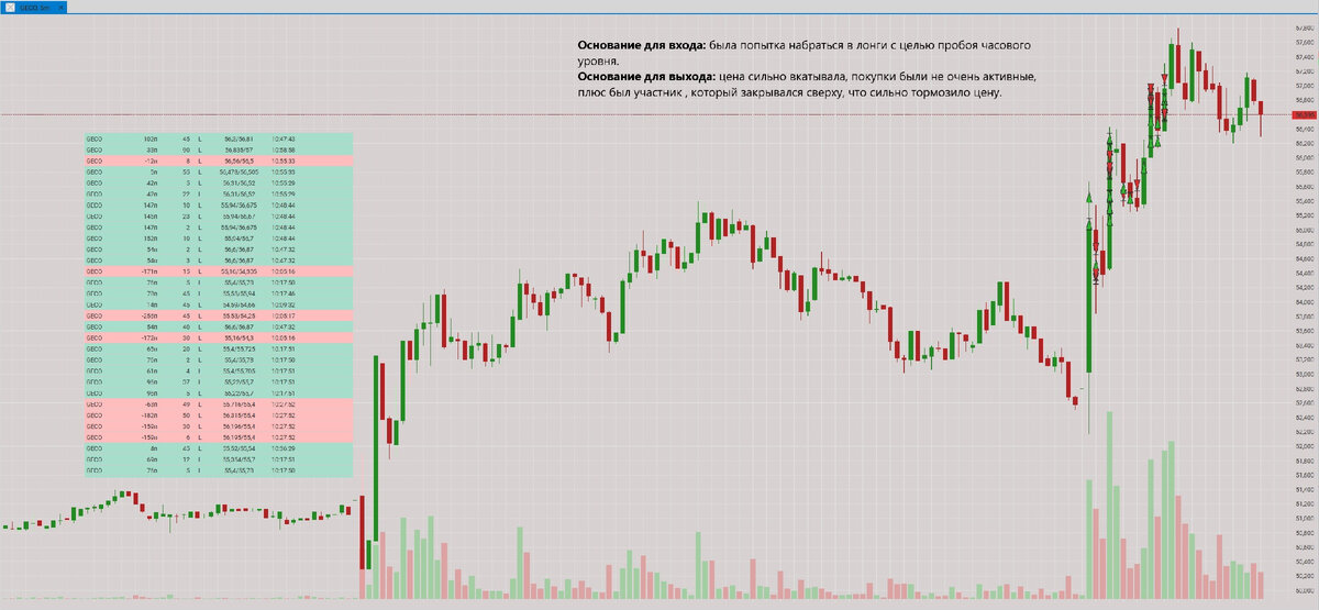 Всем привет! Сегодня понедельник и начало новой недели. Очень активно ходит валюта и фьючерсы, на акциях тоже были ситуации , но буквально после часа торгов площадка акций встала в боковик. Утром часов в 9:00 удалось отработать фьючерс на юань. Валюта, которая открывается на два часа раньше уже припадала после небольшого роста, а фьючерс открылся высоко и я решил взять небольшое откатное движение в шорт. Получилось взять 11 п примерно с таким же стопом. По риску- прибыли сделка получилась 1 к 1. Не лучшее соотношение, но как есть, цена остановилась и дальше не пошла, стоять в надежде дальнейшего движения не стал и фиксанул позицию. На открытии фондовой секции, которая открывается 10:00 , пробовал взять движение по SOFL , но оно резко закончилось, я зашел по самым плохим ценам и пришлось выходить по неприятному убытку. Так же торговал акцию GECO, там была идея. Она заключалась в пробитии часового уровня и очередном пампе. Но покупок было мало, они были не очень эффективны, движение шл