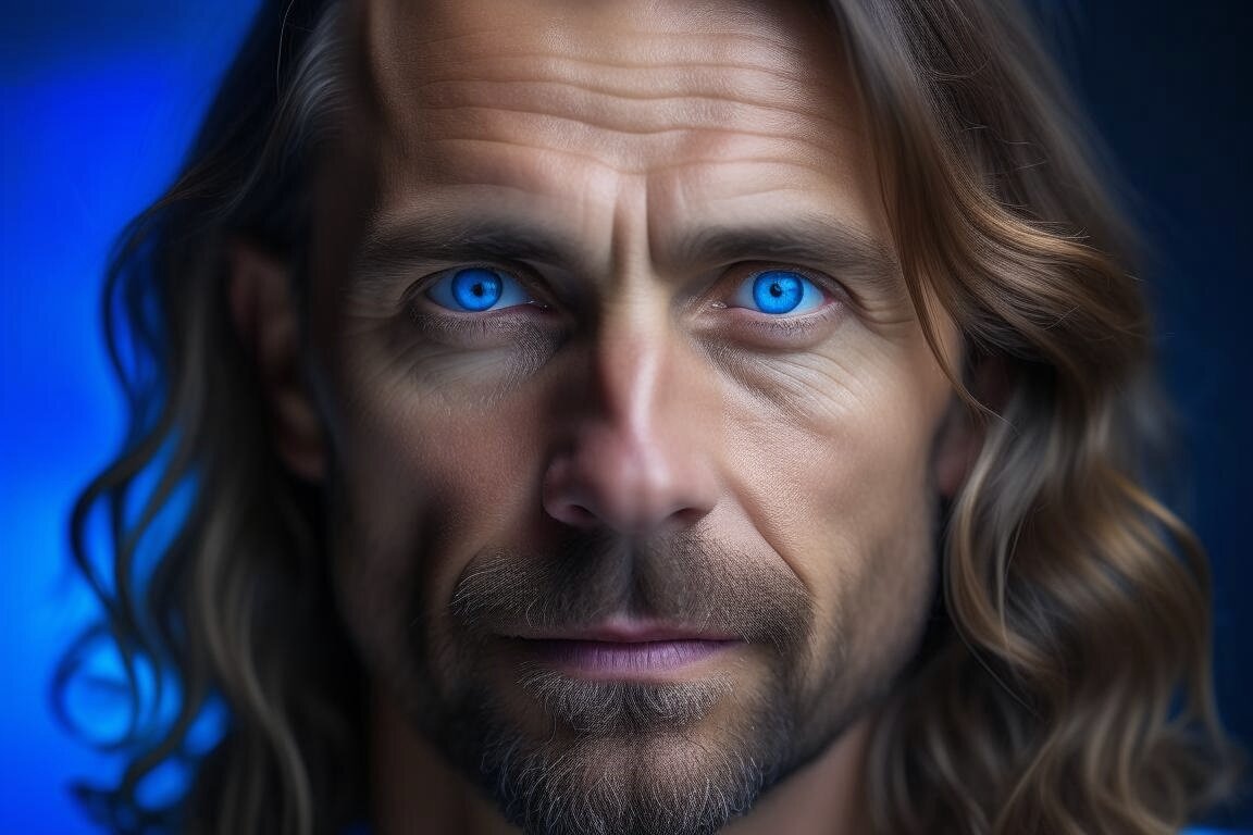 Волосы тёмно-русые, до плеч, не густые, но и не редкие. Глаза голубые, меняли цвет в зависимости от освещения.
