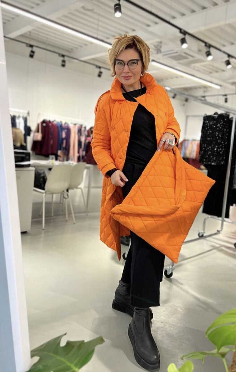 На фото ниже как раз такой пример, пальто и сумка в ярко-оранжевом цвете.
