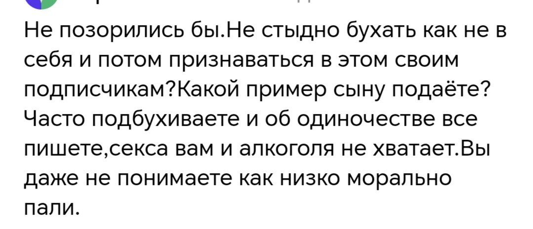Друзья мои, не собиралась писать сегодня вечером статью. Но сейчас прочла неприятный комментарий, хотя он вызвал у меня улыбку. Обвинили меня в том, что я бухаю и ещё всем вам об этом рассказываю🤣. Плохой пример сыну подаю. И мужика я хочу. В общем, Ванга мне написала. Этот коментарий я не хочу оставлять без ответа. Начну с того, что мой сын блог не читает, у него свои интересы. В тот день, когда я была на корпоративе, он уезжал в деревню с папой. За все свои 11 лет мой ребенок ни разу не видел меня по настоящему пьяной. Поэтому писать о том, что я плохой пример для сына, смешно. Миллионы женщин выпивают в присутствии своих детей и курят, и никто от этого не умер, слава Богу. И я очень рада, что мои дорогие читатели адекватно оценивают и меня, и то, что я пишу. По каким таким признакам данный комментатор определил, что я часто прибухиваю и что мне кекса не хватает, не знаю. Я очень многие статьи и названия к видео пишу с юмором. И слава Богу, что большая часть моей аудитории это