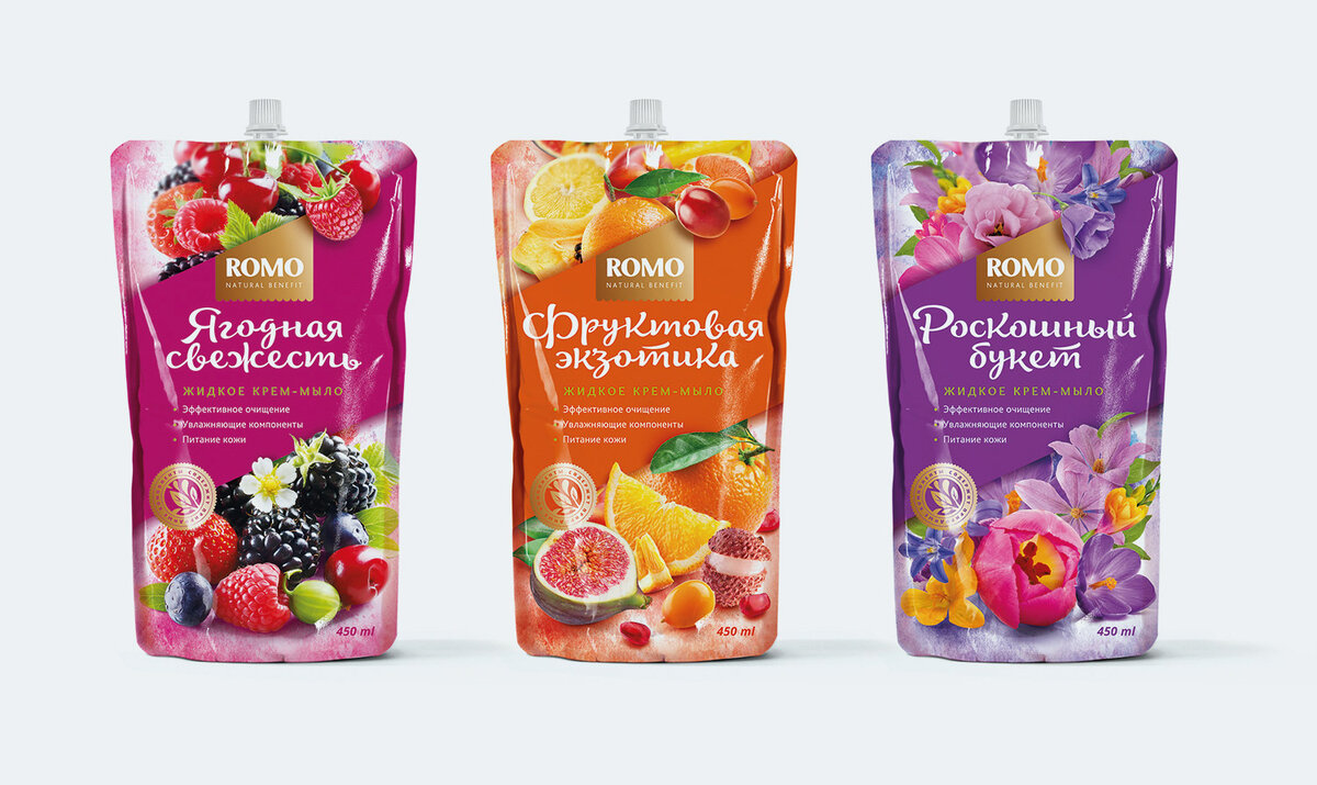 При разработке упаковки жидкого мыла и гелей для душа ставилась задача создать максимально яркий и привлекательный образ. Необходимо было решить проблему с заметностью упаковки на нижних полках торговых центров. Продукт ориентирован на широкую аудиторию: женщин в возрасте от 25 до 50 лет, имеющих уровень дохода ниже среднего. Созданный дизайн упаковки максимально отвечает поставленной задаче: она яркая, имеет большие зоны достаточно крупных, привлекающих взгляд фотоизображений, собранных в эффектные композиции. Диагональная полоса чистого цвета помогает акцентировать внимание на бренде и информации. Дизайн имеет возможности по трансформации, что позволяет создать серию из трех, представленных в продажу ароматов. Статьи, новости, кейсы по дизайну и брендингу смотрите на сайте: supremumdesign.com