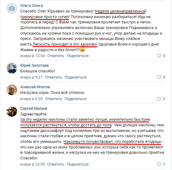 Отзывы из закрытой группы! И таких прилетают десятки каждый день. Каждый день кому-то становиться чуть легче наклоняться, кто-то чуть больше проходит сам, кто-то чуть лучше поспал. Каждый день кто-то приближается по чуть-чуть к своей цели... А ты? Для того, чтобы вступить, пиши личным сообщением в Вконтакте.