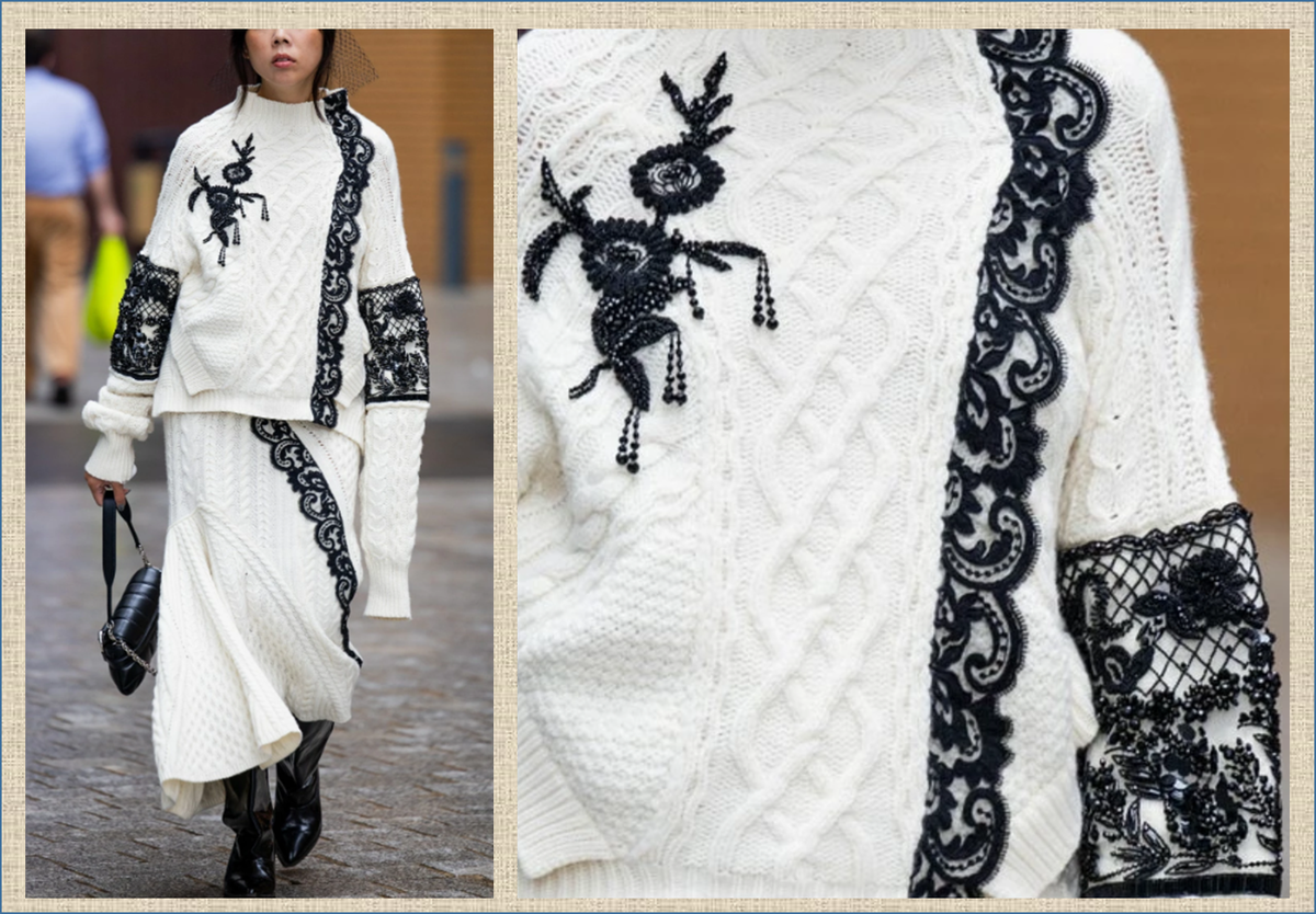 Листала страницы ВОГ, нашла шикарнейшее фото с просто таки бомбезным трикотажным костюмом. Смотрите сами: Стала срочно искать в интернете, что же это за чудо такое и с чем его едят. Это Сьюзи Лау (известный лондонский блогер) так нарядилась во время Лондонской недели моды 17 сентября 2023. И еще: это не костюм, а отдельно продающиеся юбка и свитер от фирмы ЭРДЕМ (британский бренд модной одежды). Итак. Вначале рассмотрим верх: Свитер с открытой спиной и открытой спиной, украшенный кружевом - 2545 долларов США. Рукава длинные, но в оригинале спускать их не предполагалось: Отделка вышивкой бусинами и бисером восхищает: Вязка крупная, узоры понятные: Полоска черного кружева начинается на воротнике-стойке: Дальше низ: Юбка миди с кружевной отделкой косой вязки «рыбий хвост» - 1345 долларов США. То есть выходит, что Сьюзи Лау юбку надела с поворотом на 90 градусов, то есть, на бок. А я эту юбку искала-искала, и все какие-то не такие встречались. А оказалось, что хвост то у этой юбки на само