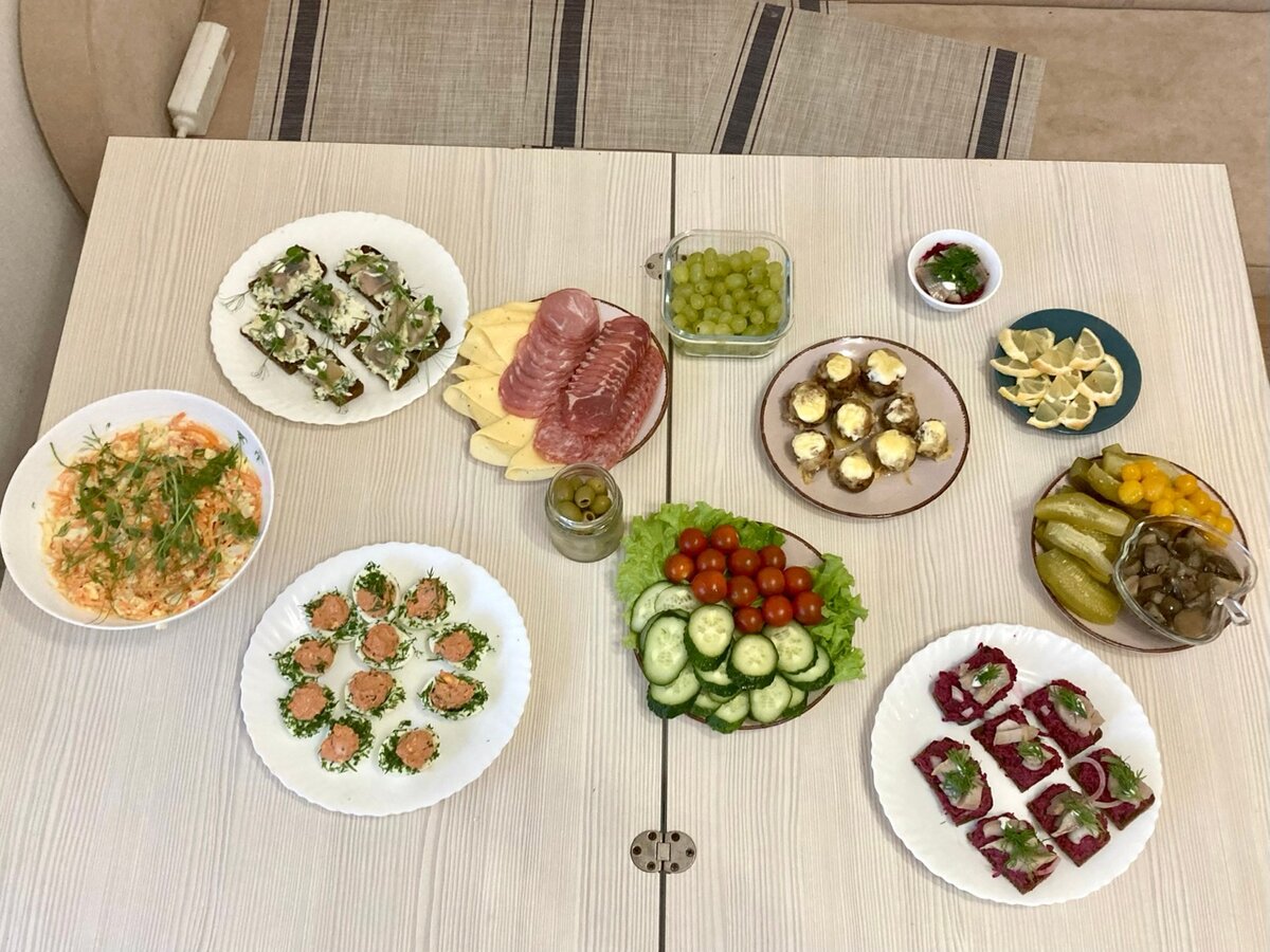 Привет. На выходных к нам приходили друзья, и я накрывала небольшой стол. Было 4 взрослых и один ребенок. Приготовить мне надо было быстро, пока муж гулял с дочкой. Да и не фанат я тратить пол дня на то, чтобы накрыть стол. В итоге справилась за 2 часа. Меню вышло бюджетным, где-то 2500 рублей за весь стол. И еды чуть меньше половины осталось. Поделюсь с вами простыми и вкусными рецептами. Нарезка сыра, колбасы и деликатесов. Все это можно купить по акциям за небольшие деньги. Выглядит красивее, чем когда нарезаешь сама, да и быстрее. Из фруктов был только виноград и лимон дольками. Я заказывала доставку, и там еще были бананы, но их привезли абсолютно зелеными. По итогу виноград ел только ребенок.