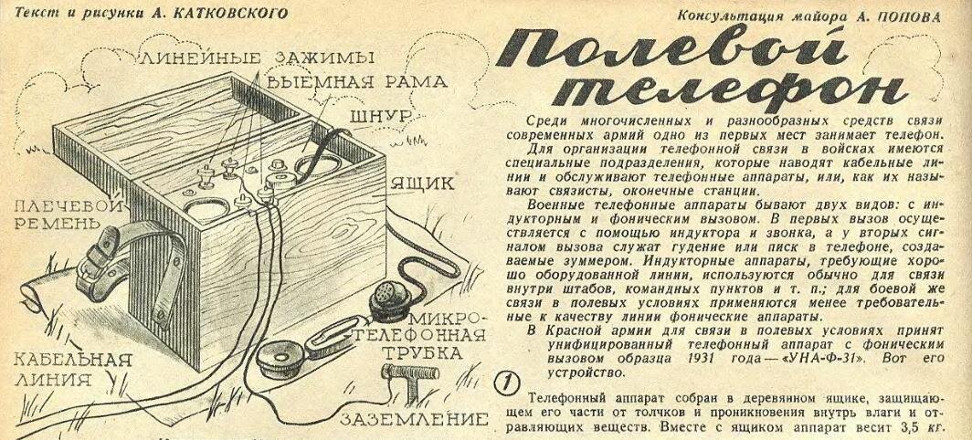 В Красной армии для связи в полевых условиях принят унифицированный телефонный аппарат с фоническим вызовом образца 1931 года- "УНА-Ф-31". Вот его устройство.