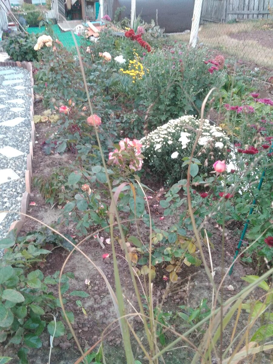 Добрый День Дорогие Мои. Сегодня расскажу и покажу как я Не традиционно решила в этом году укрыть свои розы. Вернее укрывать я их буду, как и раньше , двумя слоями самого плотного Спандбола, плотностью 90 и 100. А вот как я подготовила свои розы под укрытие, я вам покажу. Может кто- то из читателей уже так укрывали розы и у них было все хорошо? Поделитесь. Начну с главного. Свои розы я всегда начинаю готовить к укрытию в сухую, солнечную и желательно теплую погоду. Не хочу потом возиться с ними в сырость или холод. Пусть они еще стоят с бутонами или даже цветут, но я решила что хватит и им пора на покой. Все таки розочки все молоденькие и не окрепшие, этого года посадки, подумала пусть отдыхают уже и еще копят силы для успешной зимовки и будущего цветения...Конечно жалко было удалять бутоны и цветы, хочется еще любоваться и любоваться, но для любования у меня еще остались Хризантемы и парочка Крупнолистных Гортензий. Те еще все цветут и цветут. Все это я делала 7-8 октября, на улице было +16 градусов, солнечно, безветренно и сухо. Поработала на славу и с удовольствием, пока солнце не село. До работ с Цветником все выглядело Вот Так.